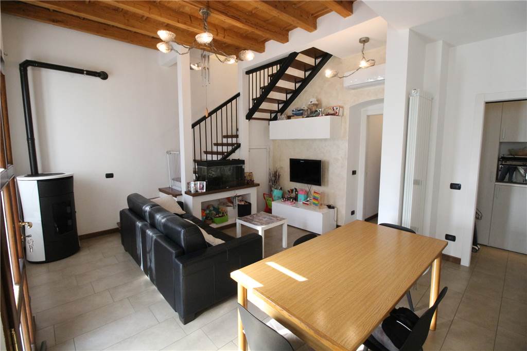 Appartamento esclusivo su due livelli con travi a vista, doppi servizi, giardino, cantina e posto auto coperto sito in zona centrale del comune di Brembate in provincia di Bergamo, nelle immediate vicinanze del casello autostradale