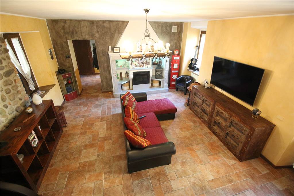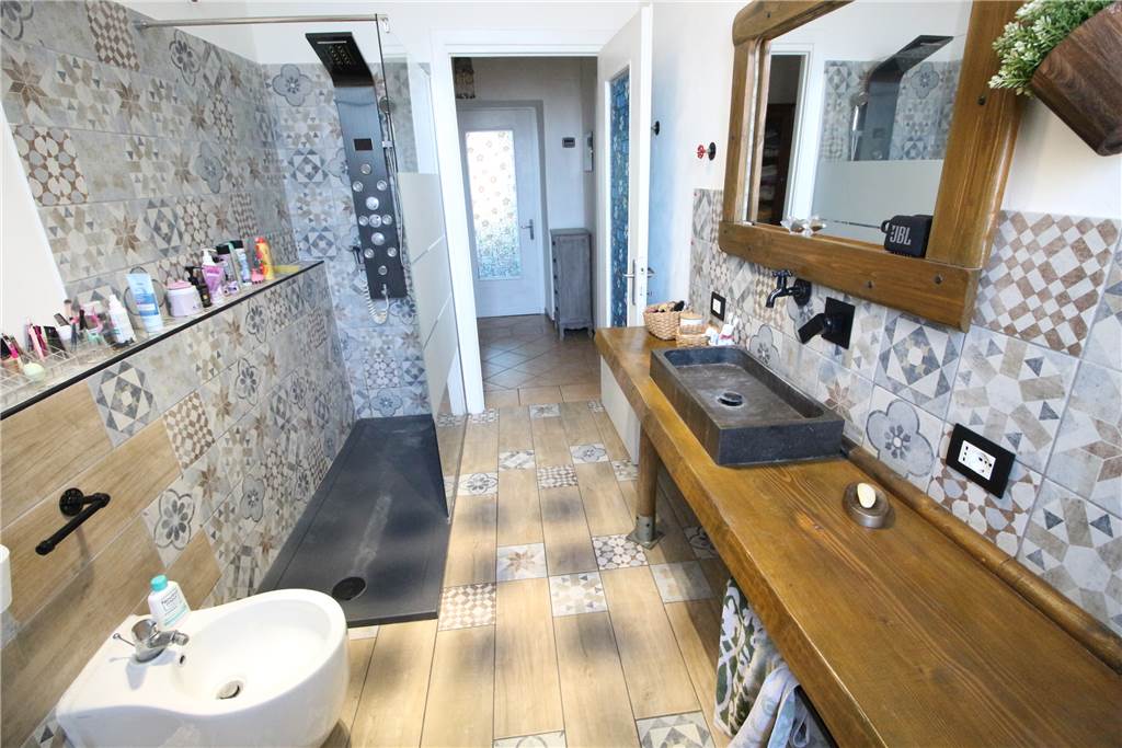 P.T.: ingresso in ampio cortile con possibilità di ospitare più autovetture, portico, ampia zona giorno con particolari inserti in sasso a vista e camino a pallets, cucina abitabile con locale dispensa e primo bagno di servizio.